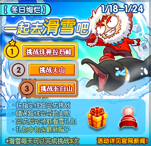1、通过挑战三座高山获得滑雪礼包。(长白山、阿尔卑斯山、珠穆拉玛峰);